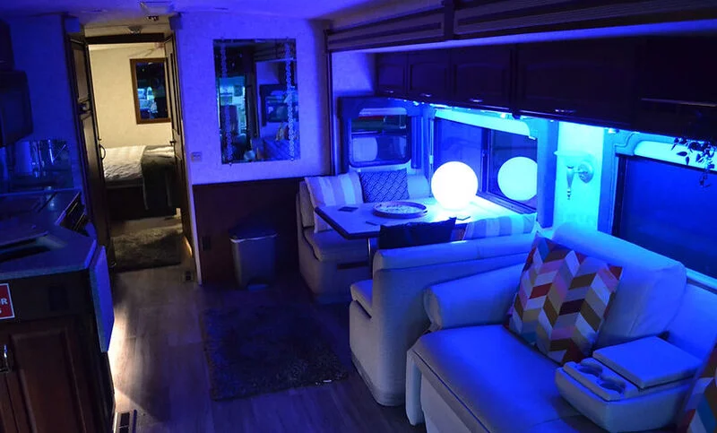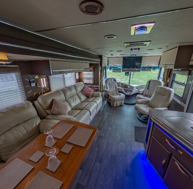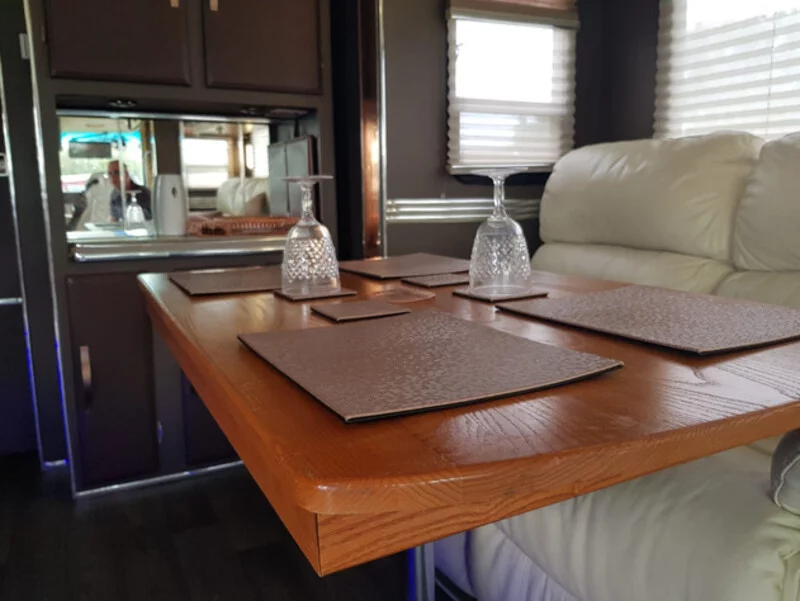 This stalwart of the American RV world has triple slides creating a large lounge area and bedroom. This RV is decorated as per “Chic Hotel Room” theme with leather, rose gold and cream accessories, wood effect flooring.