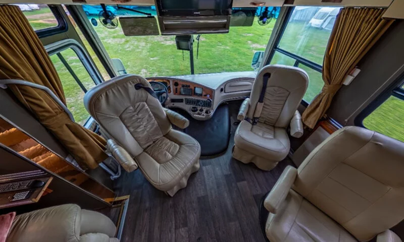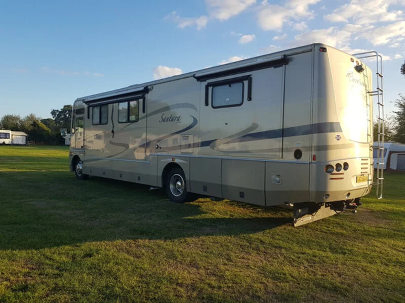 The RV has a full luxury leather interior, two cream leather recliners, built in generator, air conditioning, central heating throughout, large bedroom with cupboards, separate bathroom and toilet, separate shower room, double American fridge freezer, full cooking facilities, privacy blinds throughout, two integrated UK converted TVs, and a push-button full awning.